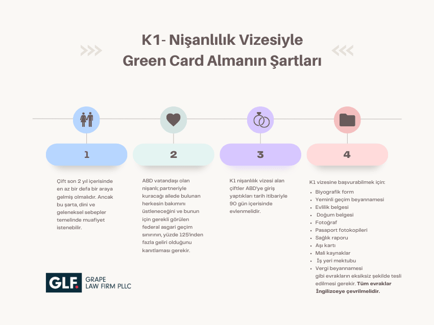 Amerikan vatandaşı nişanlınız varsa, Green Card başvurusu yapmadan önce K1 nişanlılık vizesine başvurmanız gerekir. Bunun için öncelikle Göçmen Nişanlı Dilekçesi (I-129 formu) doldurulmalı ve ABD vatandaşı olan kişi, nişanlısının başvurusunu Göçmenlik ve Vatandaşlık Hizmetleri İdaresi’ne (USCIS) göndermelidir. Onay süreci yoğunluğa bağlı olarak 6-8 ay sürebilir. Onay aldıktan sonra, ABD vatandaşı olmayan kişi K1 nişanlılık vizesi için başvuru yapabilir.